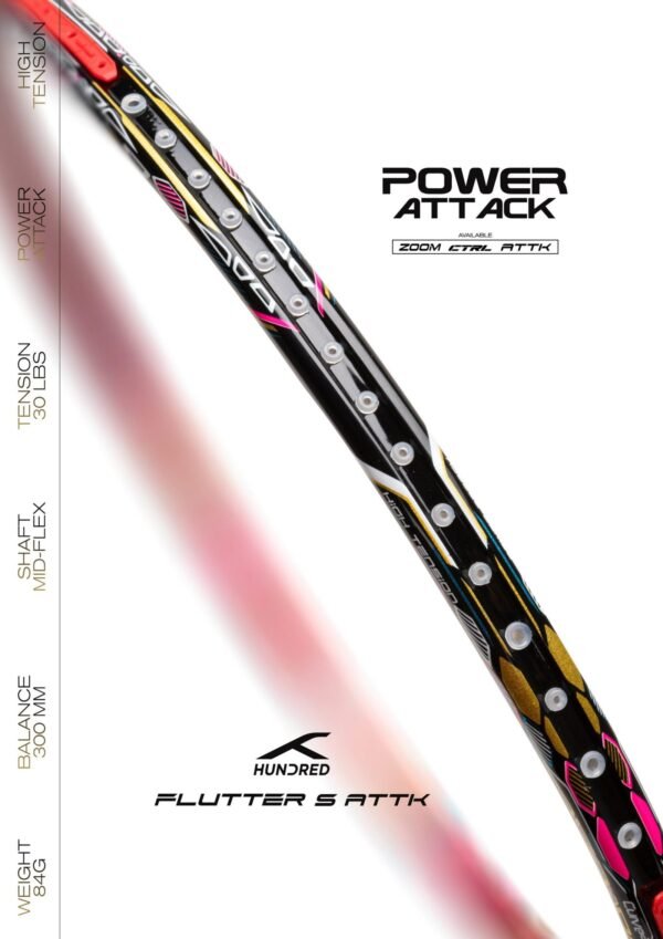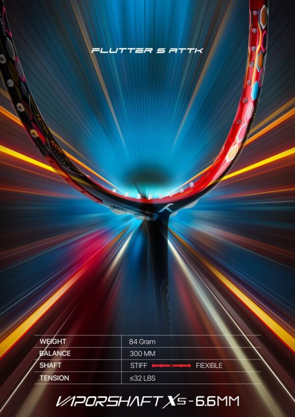 The Flutter S Attk is a powerful and controllable badminton racket for intermediate to advanced players.It has a head weight of 4U (84g) and a balance point of 300mm, which makes it a powerful racket that is good for smash attacks.