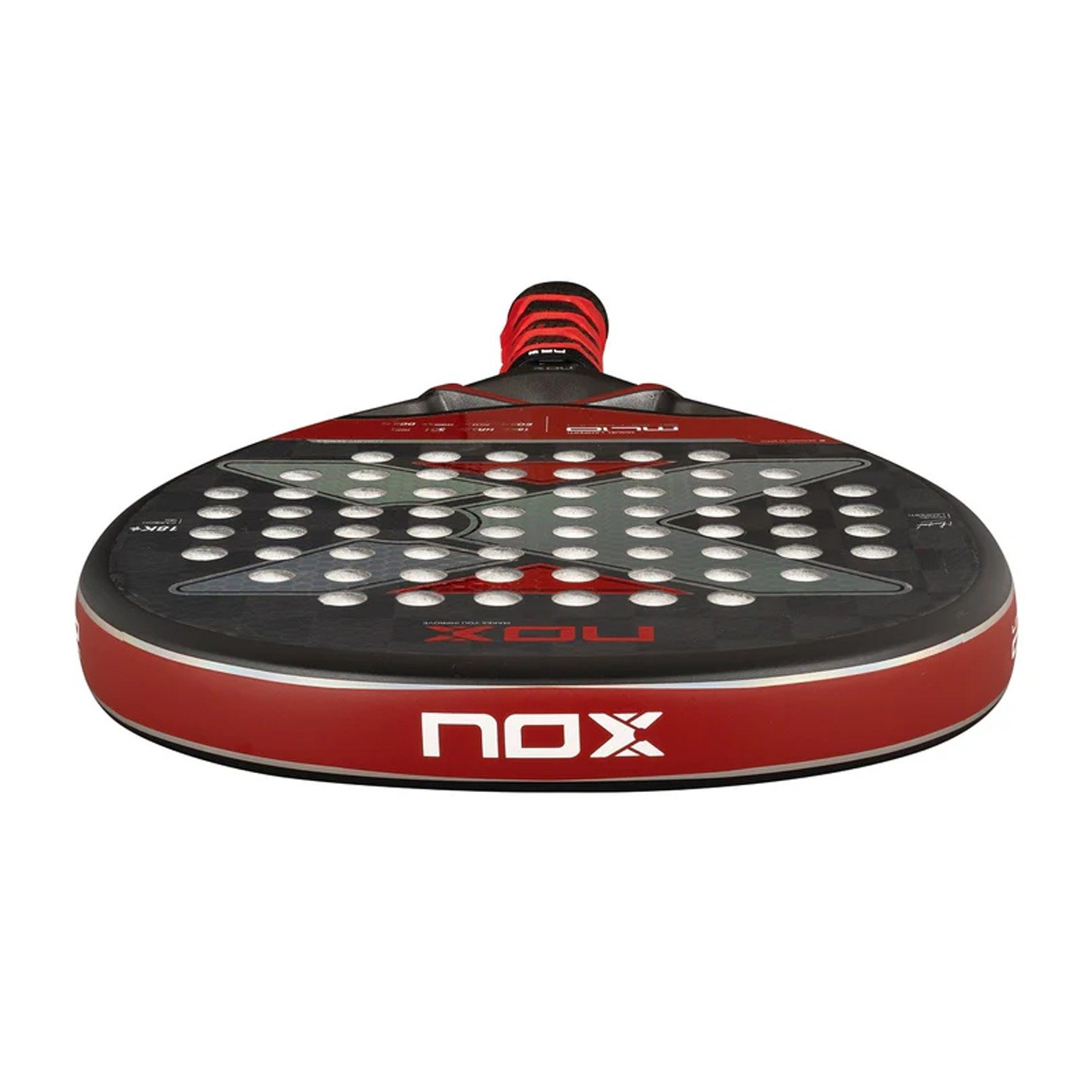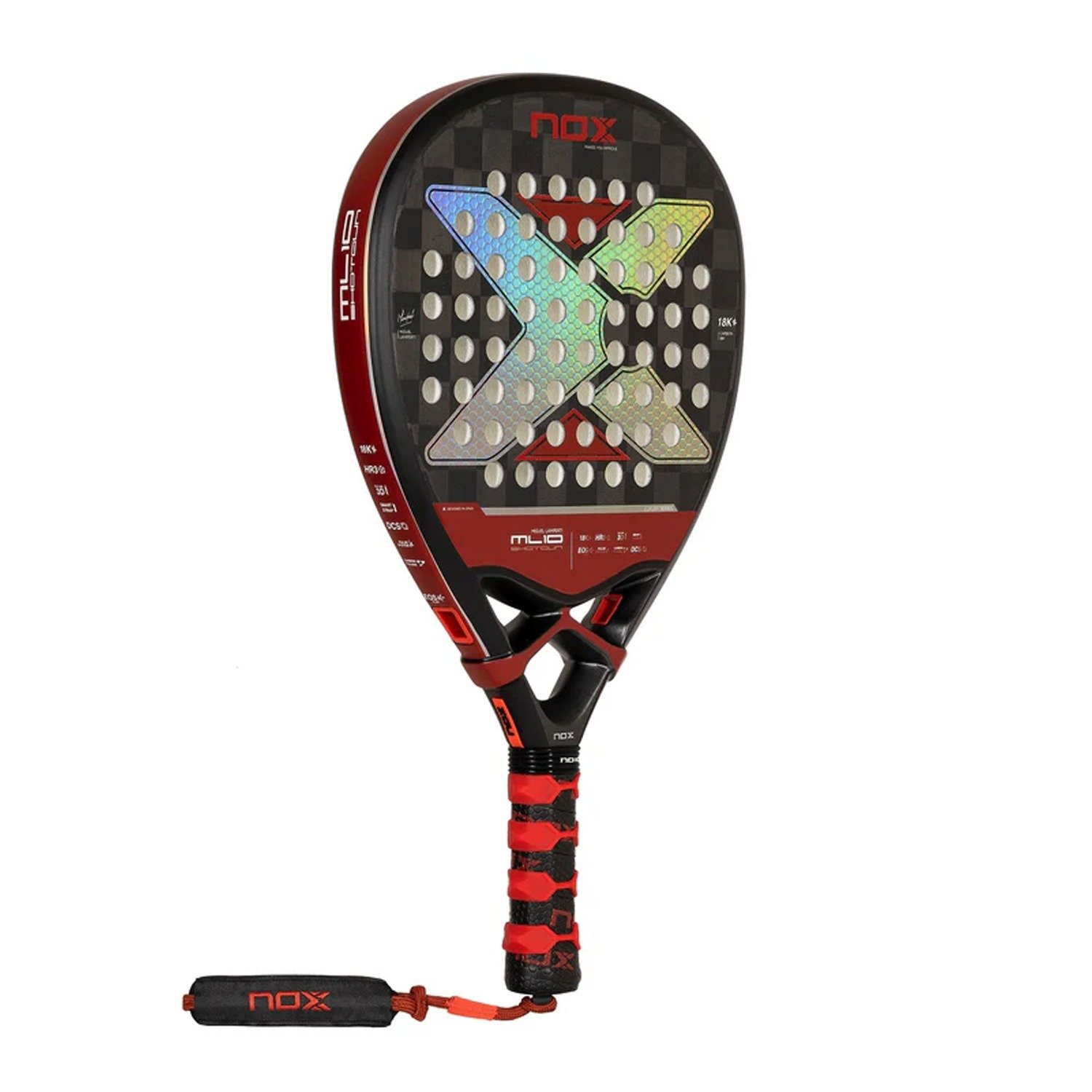 The NOX ML10 Shotgun 18K Luxury 2024 is a high performance padel racquet made for aggressive players who want maximum power but also want control. It was developed in collaboration with the professional player Miguel Lamperti and it has a diamond-shaped head, 18K carbon fiber face and a HR3 core.
